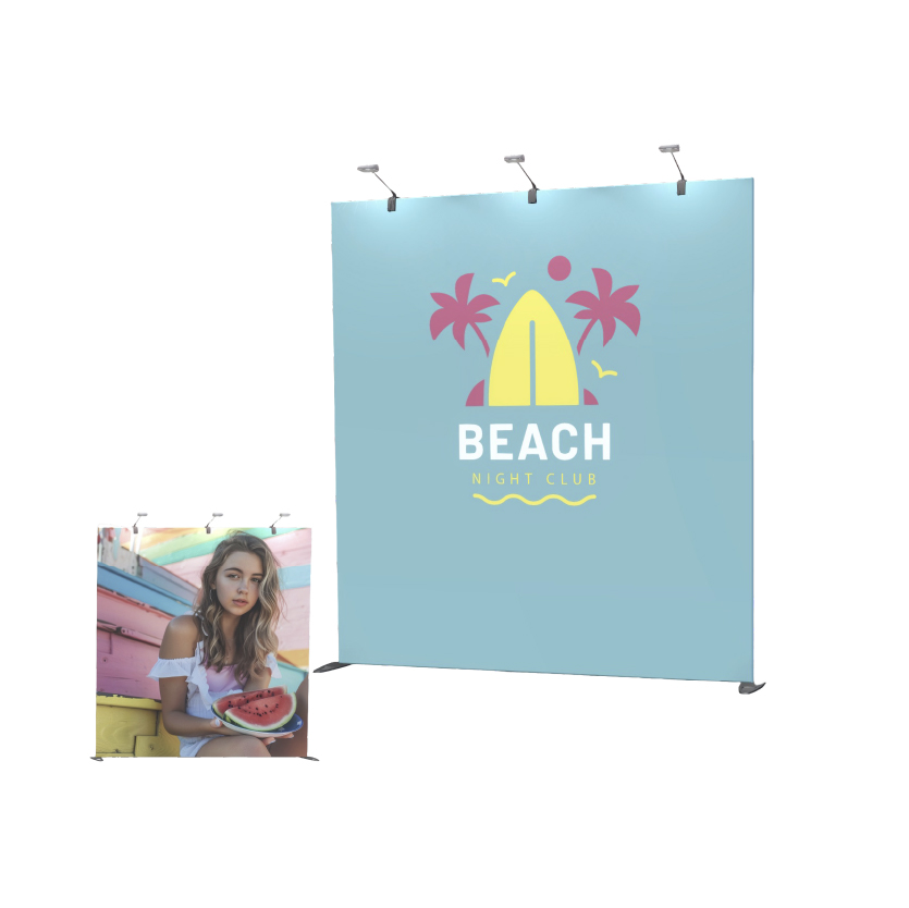 Muro portátil con sistemas de clic (no necesita herramientas) fabricado de aluminio de alta calidad, funda sublimada en selección de color de alta calidad 1 vista.