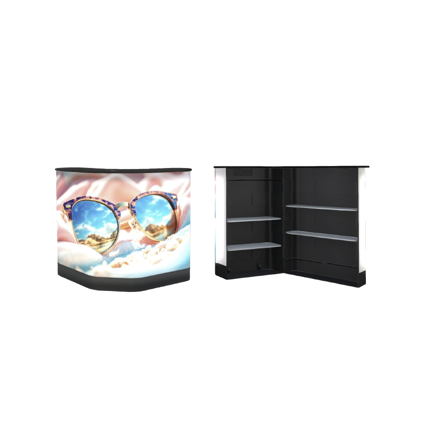 Módulo de atención podium case con gráfico en estireno, accesorios complementarios.