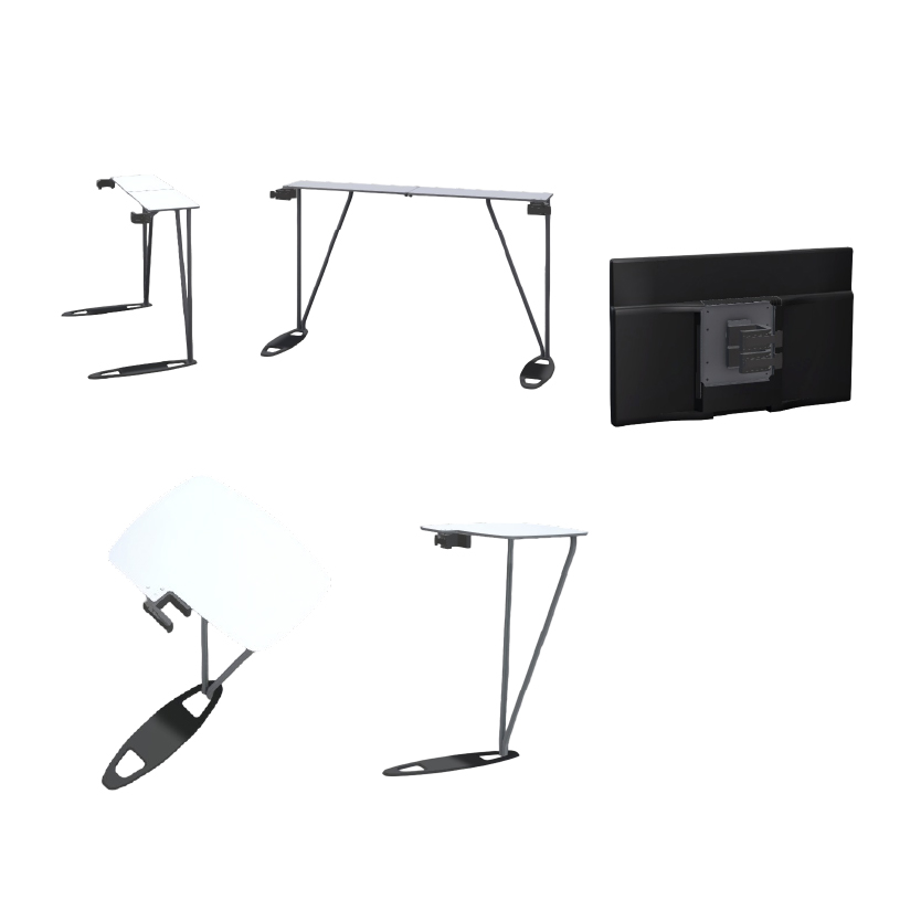 Monitor stand para sostener pantallas de hasta 15 kg. Mesa corta y larga, adaptables con sistemas de clip a los muros portátiles.