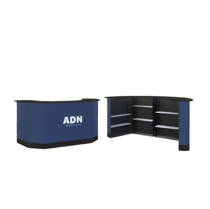 Módulo de atención conformado por 2 maletas rígidas con accesorios y gráfico en estireno.